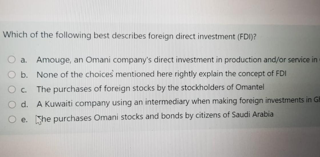 Which of the following best describes foreign direct investment FDI. Buying shares of companies in a foreign country without gaining control over management. Of Amouge an Omani companys direct investment in production andor service in Oman O b.